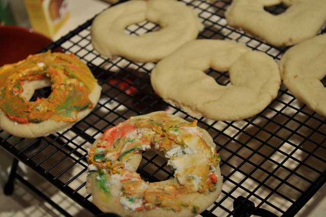 Now when I made them the other weekend, they flattened out like a sugar cookie does.  I don’t remember if hers did that or not because it’s been so long ago that I watched this episode.  And then my icing… well I used leftover icing from T’s birthday cake.  All the colors just got thrown into a tub so it really looks like the icing threw up on the doughnut crisps… but hey, they were still good 🙂