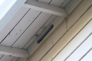 … SEVERAL swallows entering my attic! Here’s where they’re entering… The idiots who did our roof two years ago added soffit vents and didn’t put in SCREENS!
