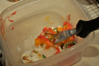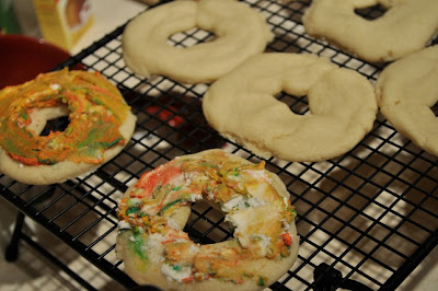 Now when I made them the other weekend, they flattened out like a sugar cookie does. I don’t remember if hers did that or not because it’s been so long ago that I watched this episode. And then my icing… well I used leftover icing from T’s birthday cake. All the colors just got thrown into a tub so it really looks like the icing threw up on the doughnut crisps… but hey, they were still good 🙂