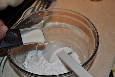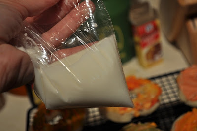 Tint with 1 drop yellow food coloring. (I left this step out…) Add more powdered sugar for stiffer consistency, if desired.