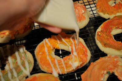 Cool completely. Frost each cookie with vanilla frosting. Drizzle Drippy Icing over cookies.