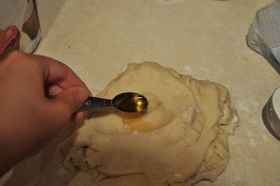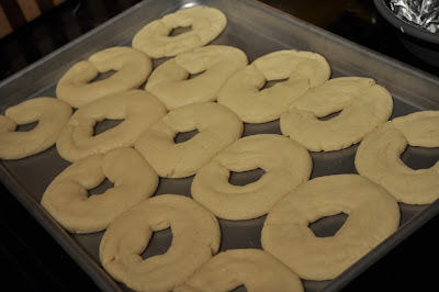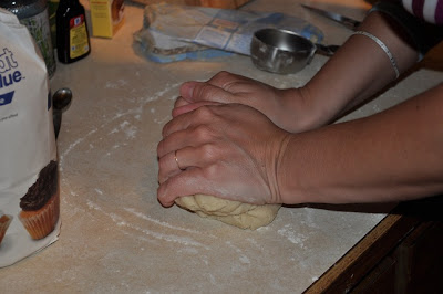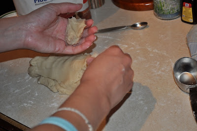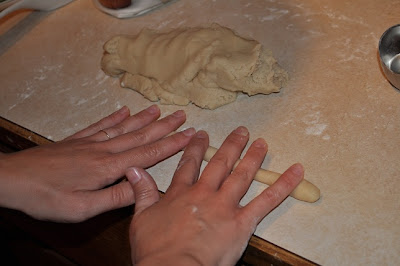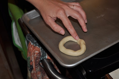 Break into 2-inch pieces. Roll each piece into a 6-inch long rope. On an ungreased cookie sheet, shape rope like a doughnut, pinching ends together.